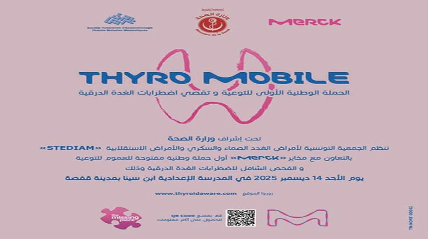 تنظم الجمعية التونسية لامراض الغدد الصماء والسكري والأمراض الاستقلابية، أول حملة وطنية توعوية يوم الاحد 14 ديسمبر الجاري بالمدرسة الاعدادية ابن سينا بمدينة قفصة وذلك تحت شعار " thyro Mobile