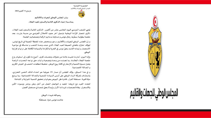 وتابع بيان المجلس قوله "إن مسار 25 جويلية هو امتداد لذلك النفس التحرري واستئناف لمعركة البناء الوطني على أسس السيادة الشعبية والعدالة الاجتماعية، بما يرسّخ دولة قوية، مستقلة القرار، قادرة على النهوض بجهاتها و تحقيق التنمية المتوازنة والشاملة."