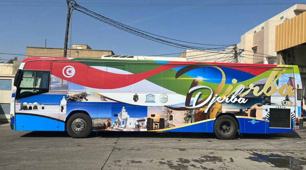تفاعلا مع الحدث الدولي المتمثل في إدراج جزيرة جربة ضمن قائمة التراث العالمي من قبل متظمة اليونسكو، وإضفاء للبعد الحضاري على قطاع النقل، إلى جانب دوره الاجتماعي والاقتصادي، بادرت الشركة الوطنية للنقل بين المدن، بتوصية من وزير النقل السيد ربيع المجيدي، باكساء 05 حافلات من أسطولها بصور تثمن الخصائص الثقافية والمعمارية لجزيرة جربة، وذلك في إطار انفتاح المؤسسة على محيطها وتنويع قنواتها الاتصالية، أسهاما منها في الترويج للوجهات السياحية المميزة ببلادنا.