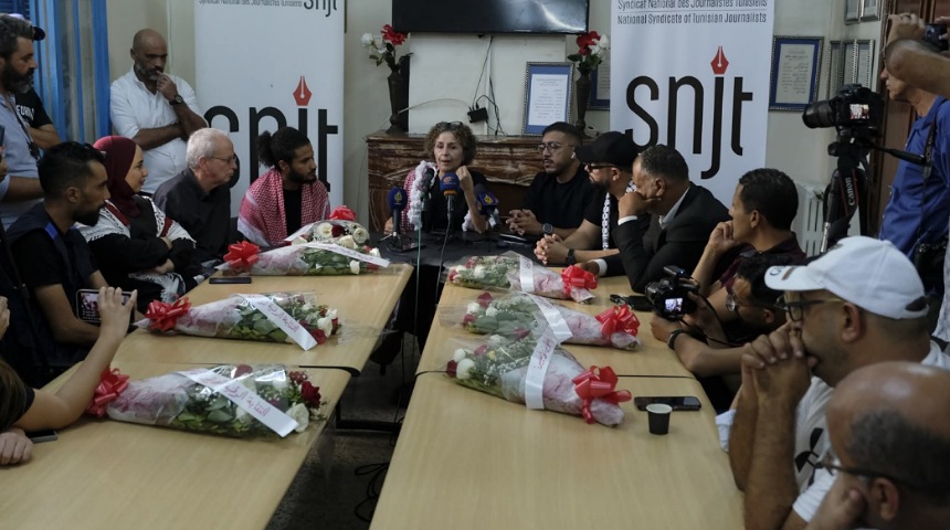 وأضاف أن تجربته كباحث في موضوع السجون لفائدة الرابطة التونسية للدفاع عن حقوق الإنسان سابقا مكنته من مساعدة المشاركين الآخرين في مواجهة "أبرع بوليس في الترهيب النفسي وهو البوليس الإسرائيلي" خلال الإحتجاز مشيدا بصمود الصحافيين الفلسطينيين رغم معاناتهم أمام آلة القتل الإسرائيلية.