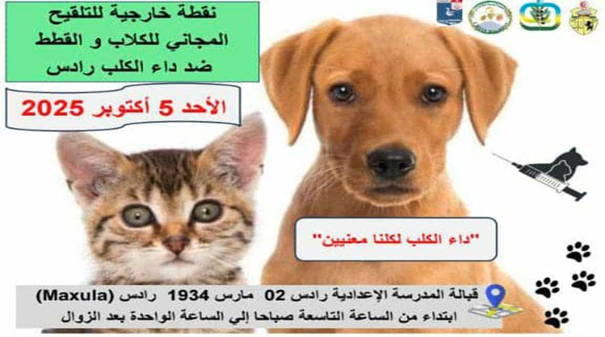 نظّمت مصالح المندوبية الجهوية للتنمية الفلاحية ببن عروس، اليوم الأحد، خيمة بيطرية لتلقيح الحيوانات الأليفة ضد داء الكلب ولتوعية المواطنين بخطورة هدا الداء وكيفية التوقي منه وتحسيسهم بمدى تأثيره على الصحة العامة وذلك أمام المدرسة الإعدادية 2 مارس 1934 "ماكسولا" بمدينة رادس.