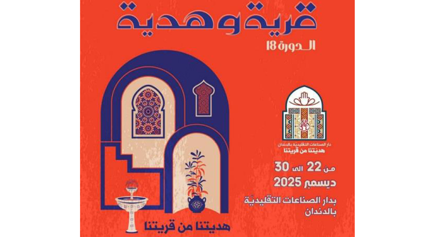 تنظم، المندوبية الجهوية للصناعات التقليدية بمنوبة، الدورة 18 لمعرض "قرية وهدية"، وذلك من 22 إلى 30 ديسمبر 2025، بدار الصناعات التقليدية بالدندان.