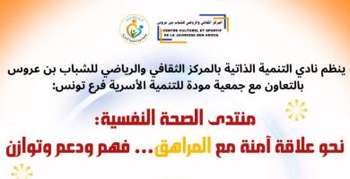 منتدى الصحة النفسية للمراهقين يوم 17 ديسمبر 2025 بالمركز الثقافي والرياضي للشباب ببن عروس