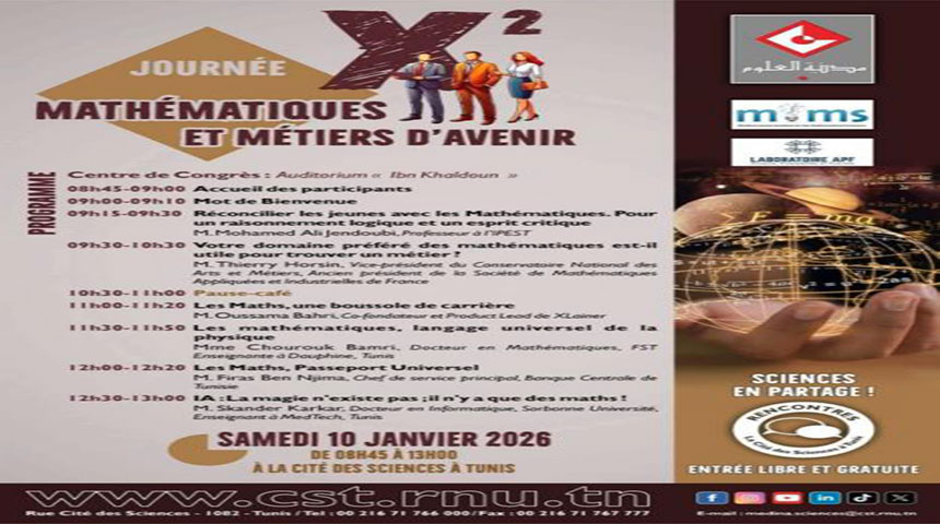 تنظم مدينة العلوم بتونس العاصمة، يوما علميا، حول الرياضيات ومهن المستقبل، وذلك يوم السبت 10 جانفي الجاري.