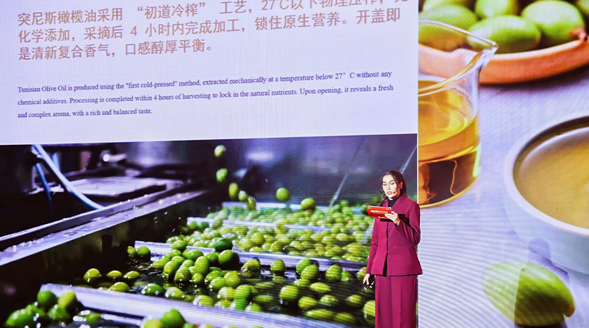 وتم الترويج لزيت الزيتون التونسي كأحد المنتجات الرئيسية لتشجيع المستهلكين على اقتنائها، حيث قدمت السيدة نرنج خير الدين وهي مواطنة تونسية مقيمة بالصين كممثلة لإحدى الشركات الكبرى الصينية المورّدة لزيت الزيتون التونسي عرضا عن الخصائص الغذائية والمنافع الصحية لهذا المنتوج إلى جانب حصص تذوق.